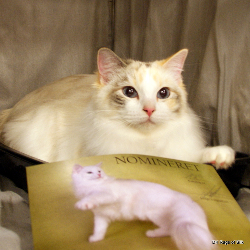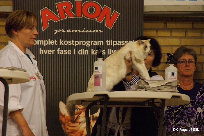 Så er vi hjemme efter en oplevelserig weekend på World Show i Ålborg. Det var første gang, vi deltog i et world show, og det var et fantastisk event med over 1600 racekatte fra hele verden. Vi havde Alix med og til vores store glæde og overraskelse fik hun sit CACS certifikat hos dommer Anne Veland, selv om hun havde skarp konkurrence fra en meget smuk kat. På ragdollklubbens stand havde vi mange besøgende, som var meget betagede af at møde en levende ragdoll på standen. Det kræver et ganske særligt temperament af en kat at befinde sig midt i Gigantium fyldt med fremmede katte, mennesker og lyde, men kattene tog det i stiv pote. Vi havde også lejlighed til at møde alle de andre ragdolludstillere til en hyggelig reception på standen, hvilket gav mange nye spændende bekendtskaber især i Skandinavien og Europa, som et kuriosum kan nævnes, at vi også mødte vi en ragdollopdrætter, der var kommet helt fra Brasilien. Læs mere om World Show 2013 og se flere billeder.