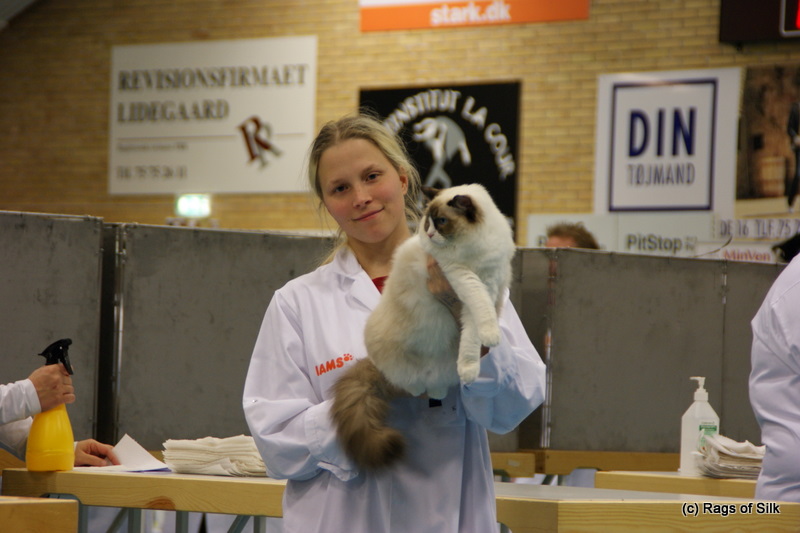 Vi deltog med Ippa og Alix bå de lørdag og søndag på udstillingen i Brædstrup. Ippa fik sine CACIB certifikater begge dage og skal nu en tur til udlandet for at opnå det sidste certifikat og blive International Champion. Det må vi se at få planlagt. Alix fik EX1 + NOM lørdag. Søndag fik hun EX 2. Hun fik fine kommentarer med på vejen af dommerne, men EX1 gik til DK Jaquets Barcelona, som er lidt ældre og derfor mere udviklet. Vi siger til lykke til Karen Jacquet og Barcelona og alle de andre ragdolls, der alle fik gode resultater på udstillingen. Tak til alle ragdollopdrætterne for utroligt hyggeligt selskab.