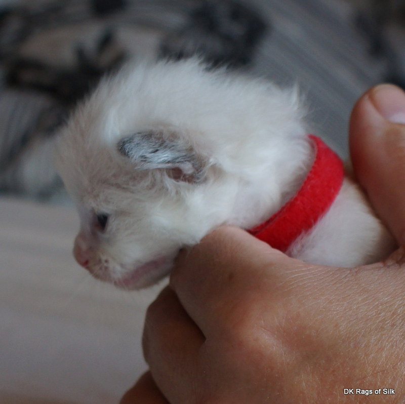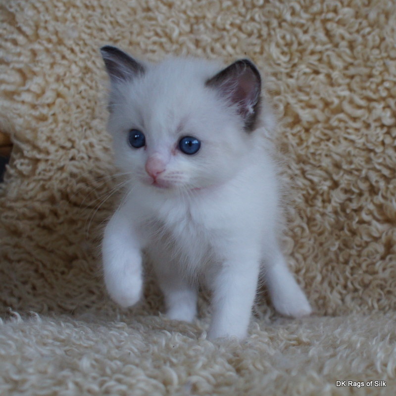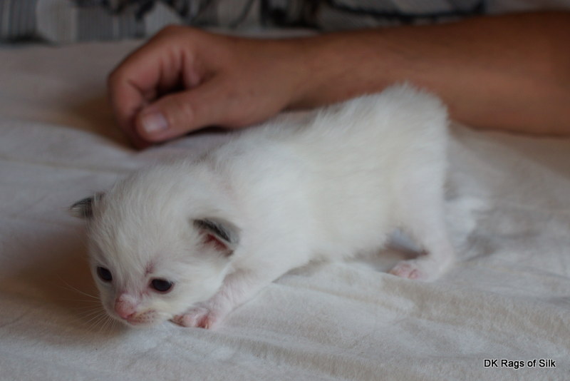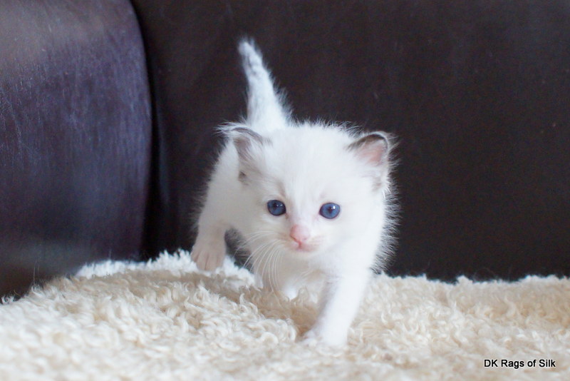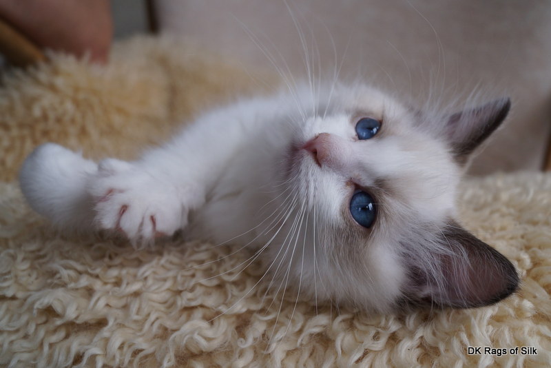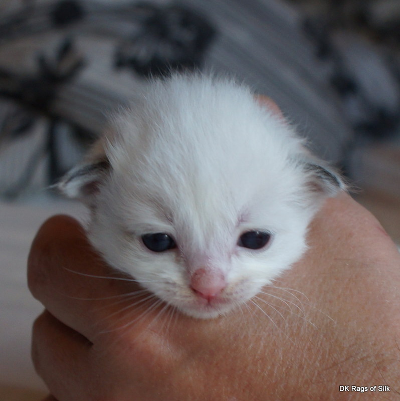 Lille Halcon vejer i denne uge 703 g, så han er ikke så lille endda. Han er en helt speciel lille ragdoll, der er helt hvid på ryggen. Ikke så meget som skyggen af en plet kan man se. Og så har han de største og mest udtryksfulde blå øjne.