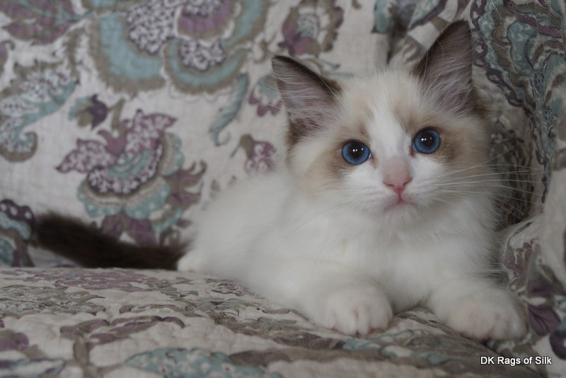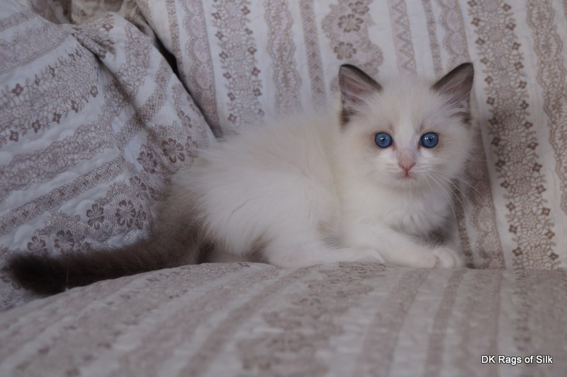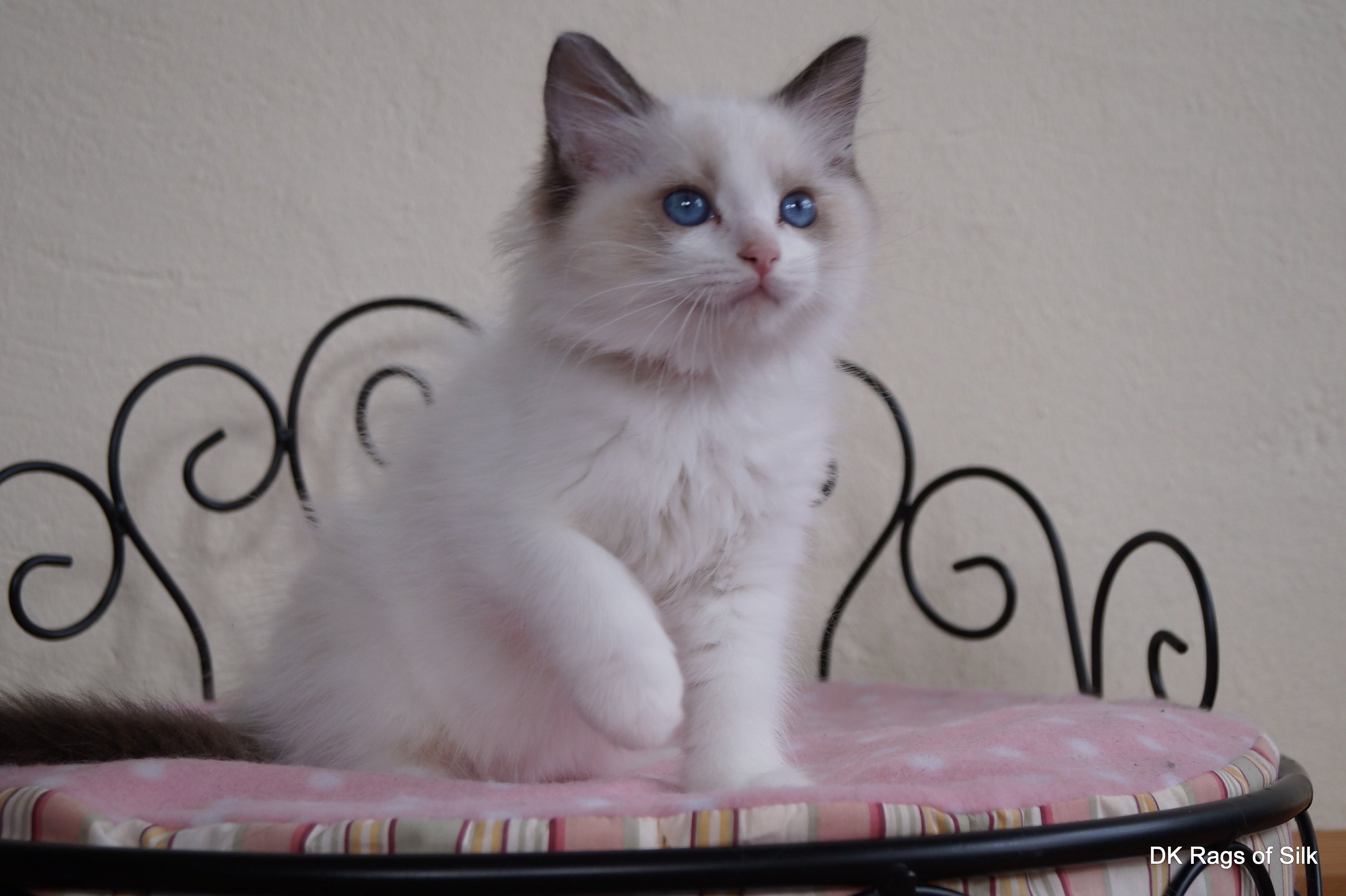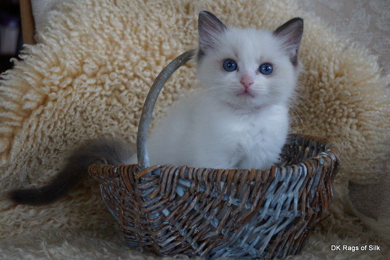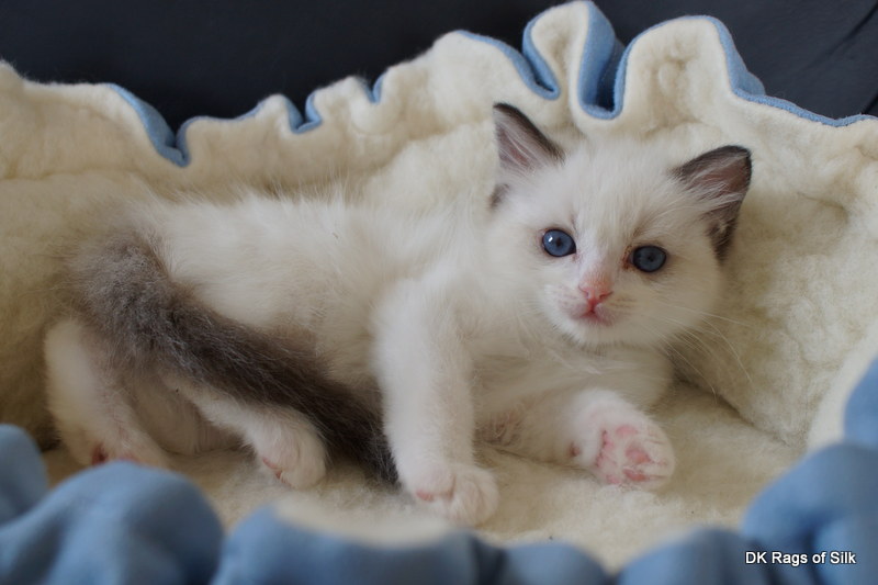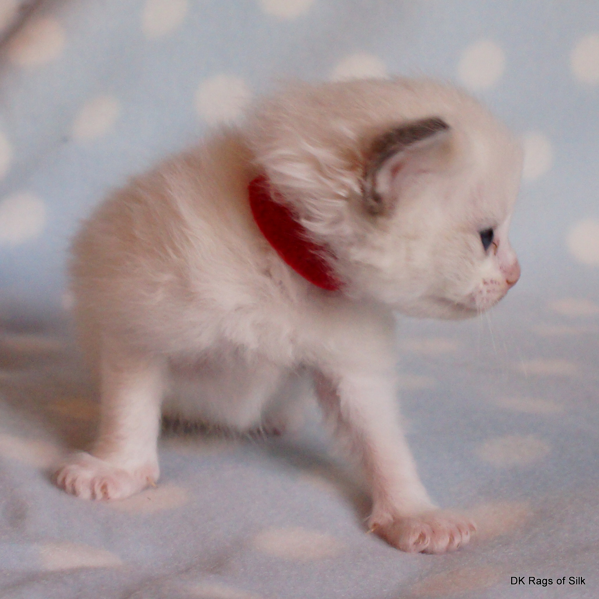 Lille Halcon vejer i denne uge 703 g, så han er ikke så lille endda. Han er en helt speciel lille ragdoll, der er helt hvid på ryggen. Ikke så meget som skyggen af en plet kan man se. Og så har han de største og mest udtryksfulde blå øjne.