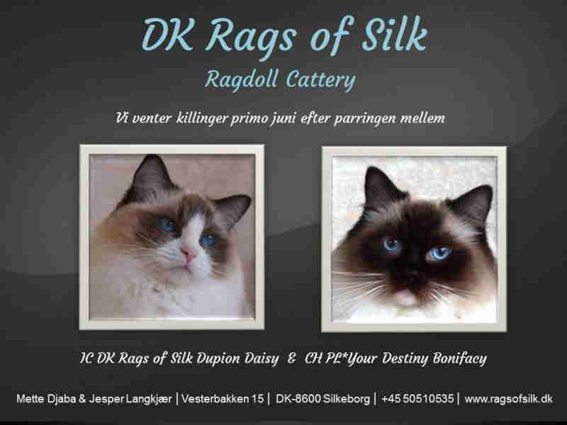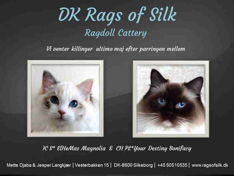 Vi tør nu endelig annoncere, at der er killinger på vej her hos DK Rags of Silk - og så hele to kuld. Hvis du allerede er på vores kontaktliste, vil vi kontakte dig, så snart vi mener, at have en killing, der kunne svare til dine ønsker. Hvis du endnu ikke er på vores kontaktliste, er du meget velkommen til at sende os en besked, så vi kan skrive dig på listen, men der vil desværre ikke være store muligheder for killinger fra ét af disse to kuld, da vi har mange interesserede killingekøbere på listen allerede.