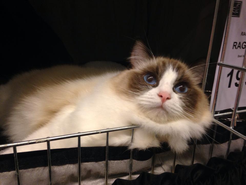 I denne weekend har vi været på katteudstilling i Dragør med DK Rags of Silk Dupion Daisy. Hun fik sit andet og tredje CAC på udstillingen og kan nu tilføje titlen champion til sit navn. Vi har haft en superhyggelig weekende med overnatning hos DK Flowerchild og to meget varme, men også hyggelige udstillingsdage med ragdollentusiasterne. Herunder ser I smukke Daisy i udstillingsburet.