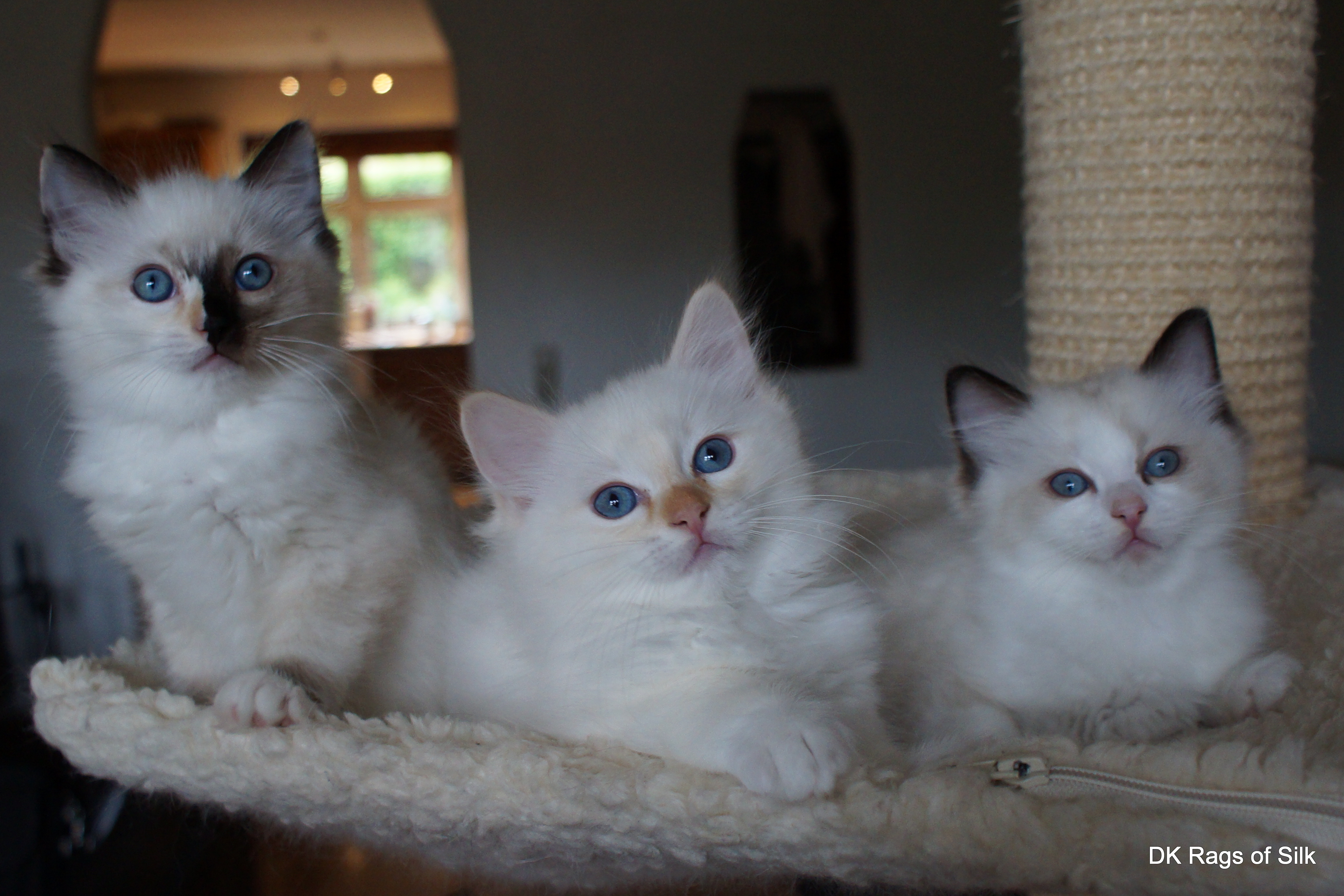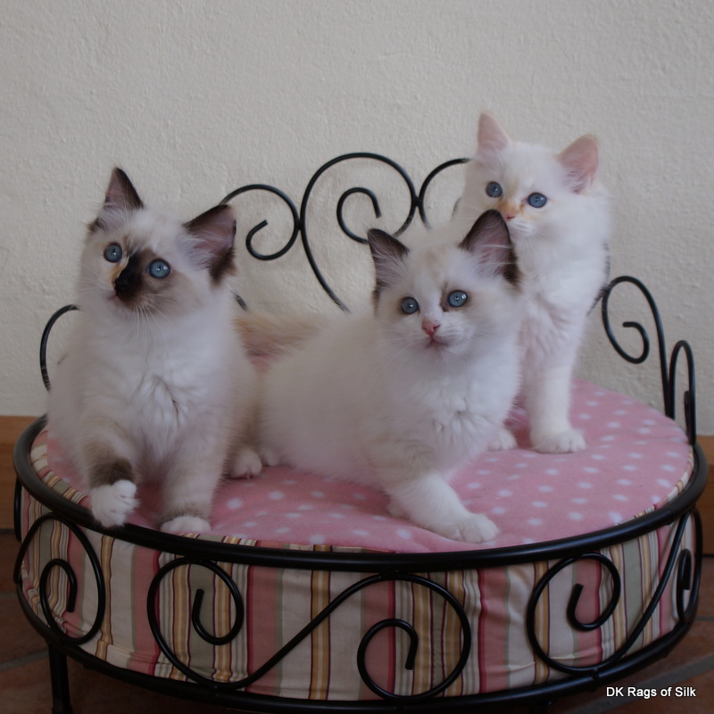 Ragdoll killingerne i Eri-kuldet er nu 10 uger, og de har forlængst indtaget hele huset. De er et charmerende trekløver, der virkelig sætter liv i huset. De er helt uberørte af, at Alix' killinger er kommet ind i deres kravlegå rd i stuen i denne uge.