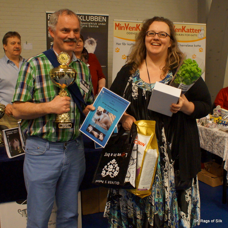 På udstillingen i Hedensted i gå r blev Ragdollklubbens Topkatte 2014 fejret. Vi er så heldige, at to af dem bor hos os. CH PL* Your Destiny Bonifacy blev nr. 2 i kategorien fertile hanner og GIC DK Vandoll Nostalgic Nike blev nr. 3 i kategorien fertile hanner. Vi takker Ragdollklubben Danmark for det meget overdå dige pokaler og de flotte foderpræmier. Dem er drengene meget glade for. Her modtager Niels fra DK Flowerchild og Mette i fællesskab præmierne for Bonifacy, som er vores fælles hankat.
