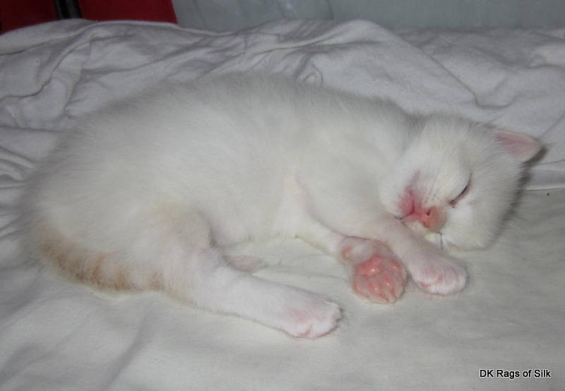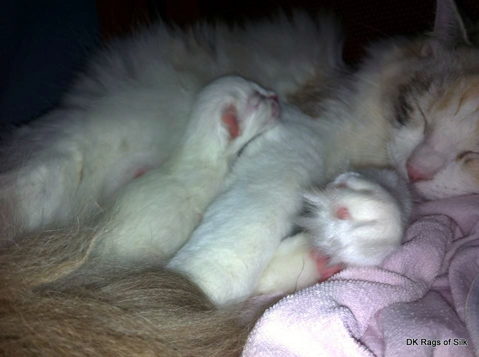 DK Rags of Silk Cocoon Caspian er nu to uger og vejer 340 g. Han er en skøn ragdoll killing, som vi bare nyder at følge dag for dag. Magnolia er en fantastisk mor, der bare passer og plejer den lille fyr.